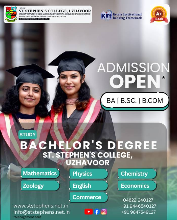 llock in majestic splendour and set against a lush verdant backdrop, St. Stephen’s College is the pride of Uzhavoor. The College, which belongs to the Arch-Diocese of Kottayam (Knanaya Catholic Community), is affiliated to the Mahatma Gandhi University. The College has been graded A+ by the National Assessment and Accreditation Council (NAAC) in 2022.